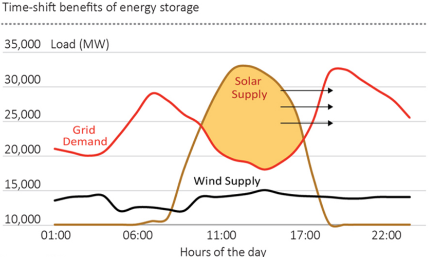 החיצים השחורים על גבי הגרף מראים את הפער (בזמן) בין השעות שבהן האנרגיה הסולרית זמינה לשעות השיא של הביקוש לאנרגיה.